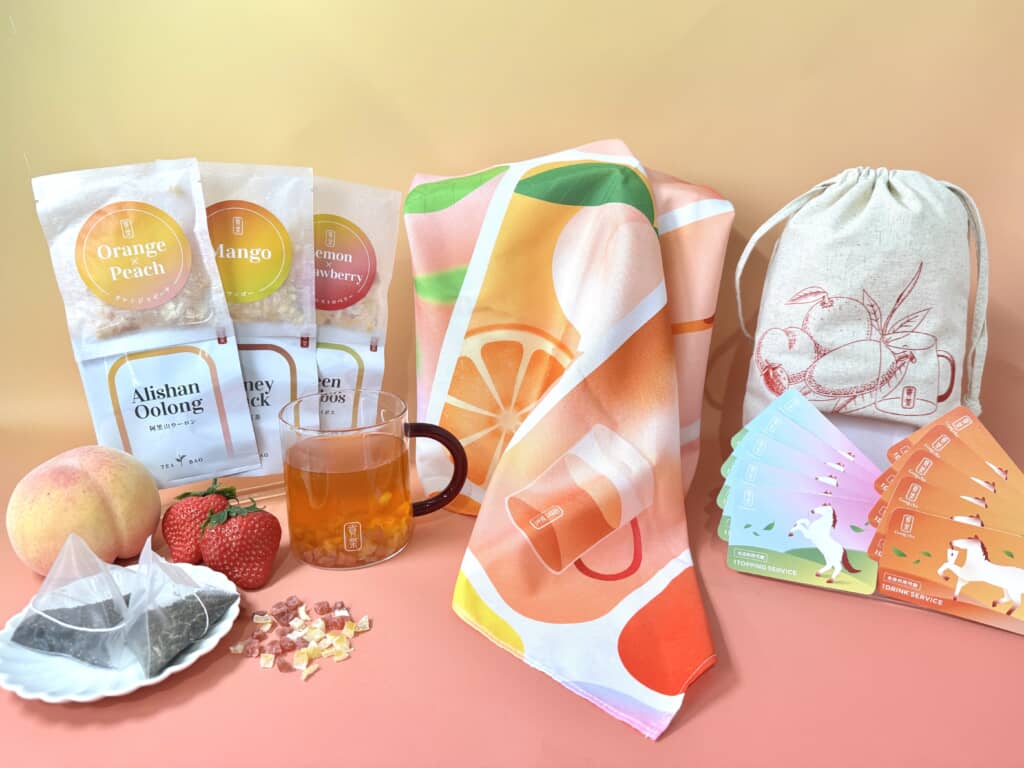 お茶とドライフルーツをセットにした「フルーツティーアソート」と、オリジナルデザインのグラスマグカップ