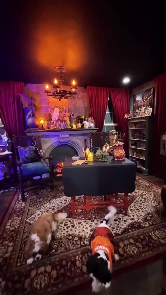 棚には本や装飾品が整然と並び、その中心には大きな白いフクロウのアートが飾られています。『ハリー・ポッター』シリーズを思わせる世界観に統一されており、主人公ハリーのフィギュアも置かれていますね。空間全体がオレンジ色の光に包まれ、現実の部屋でありながら、完全に“異世界の一室”として成立しています。