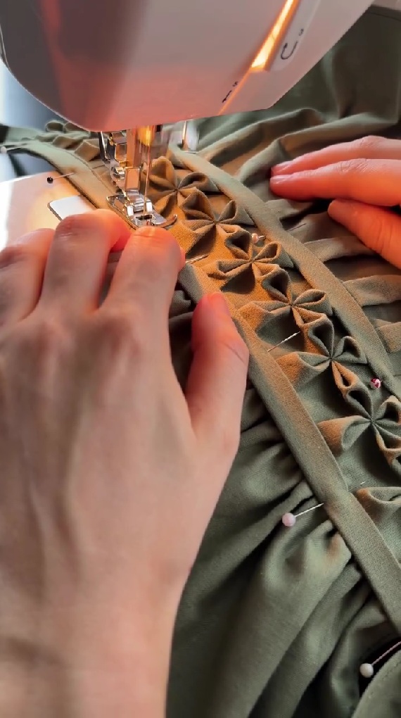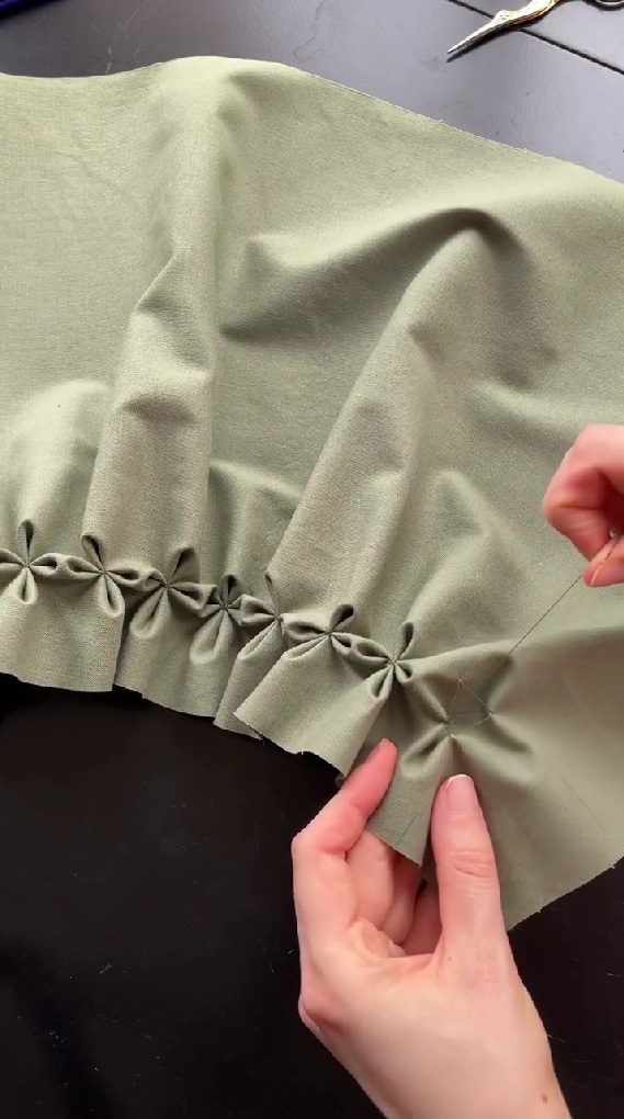 今回ご紹介するのは、立体的な花模様を浮かび上がらせていく裁縫動画です。投稿者さんはオリーブグリーンの布に静かに針を通していきます。布をつまみながら四角に縫ったあと、さらに中をクロスに縫うことで、糸をきゅっと引くと花模様のような折り目が出来上がりました。
