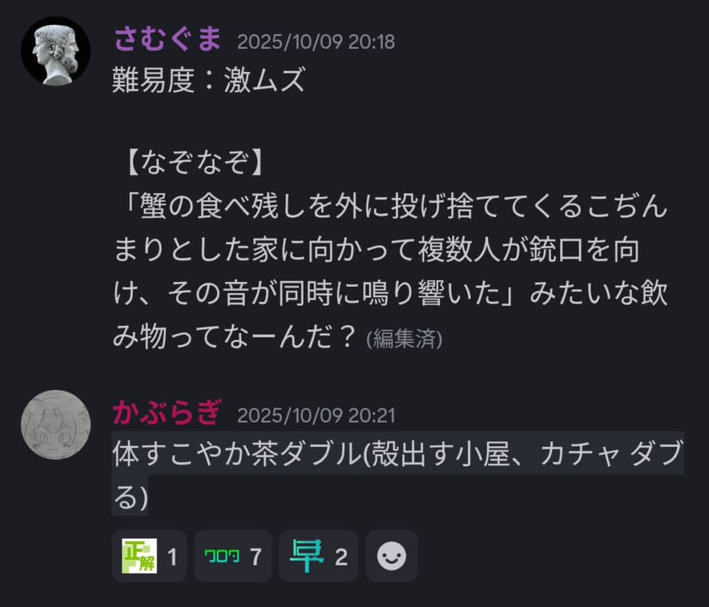 あまりの意味不明さに、Xでは「無理ゲーすぎて草」と悲鳴が上がったこの難問。ところが実際のDiscordでは、意外なまでにすぐ解決されていました。出題から3分ほどで、正解する猛者が現れたのです。