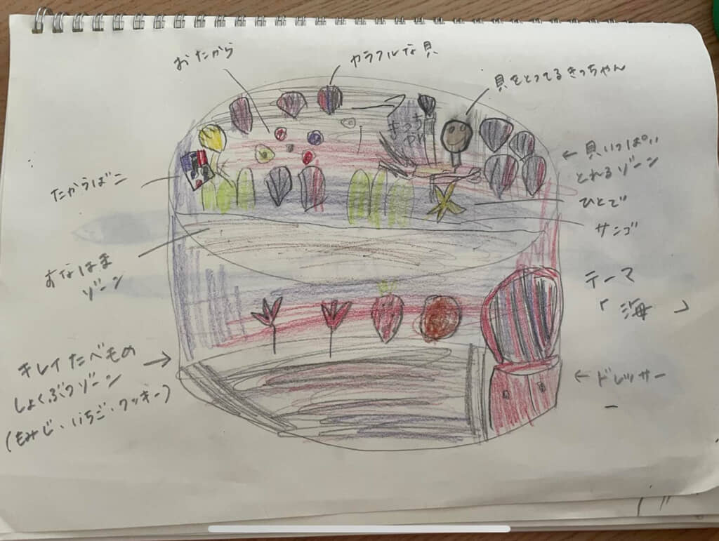 リクエストしたのは、下島さんの6歳の甥っ子くんだそうです。紙に描かれたケーキのテーマは海。ホールケーキの上部には“すなはまゾーン”や“貝いっぱいとれるゾーン”があり、“おたから”や“カラフルな貝”などが散りばめられています。子どもらしい自由な発想で、実現するのが難しそうですが……。