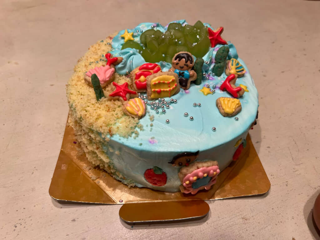 どうするか悩みながら、下島さんが完成させたのは、鮮やかな水色や散りばめられた装飾が目を引くホールケーキです。砂浜と海中が一面に共存しているような世界観で、上部にはカラフルな貝や海藻などがぎっしり。周囲にはかわいいキャラクターなどが描かれ、細かい部分までしっかりとリクエストに応えています。すごい!