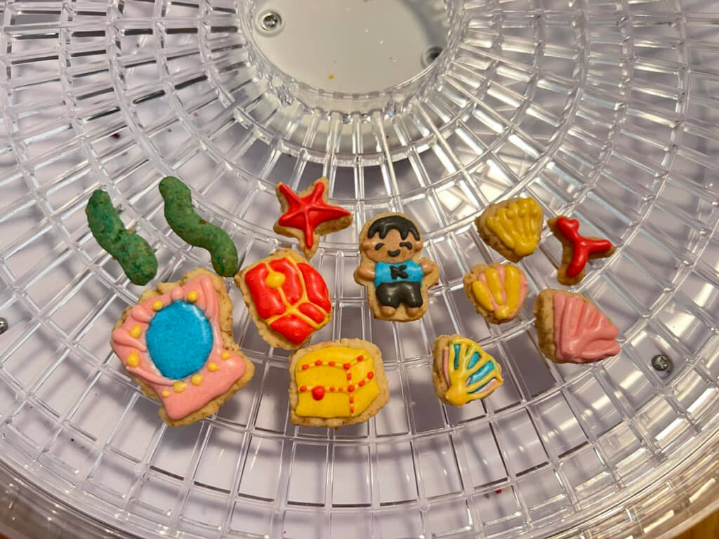 ケーキの上に並んでいる各パーツは、クッキーのような生地の上に黄色や赤といったさまざまな色でデコレーション。ヒトデや海藻といった海の幸に加え、宝箱やドレッサーといったアイテムが並んでいます。甥っ子くんと思われる人物のお菓子もあり、本人も喜んでくれることまちがいなし!