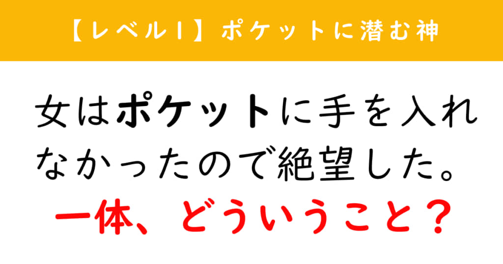 女はポケットに手を入れなかったので絶望した。一体、どういうこと? 「ウミガメのスープ」クイズに挑戦!【レベル1】