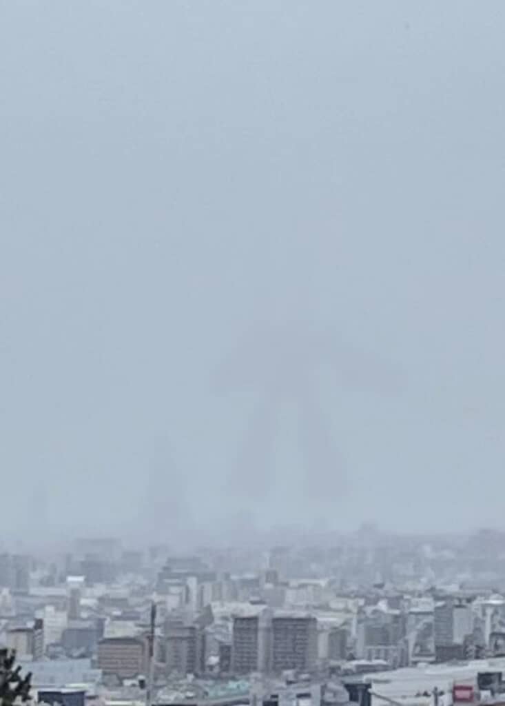 大阪市阿倍野区のランドマークとして知られる商業施設「あべのハルカス」を、10キロ以上も離れた東大阪市石切町から捉えた写真。薄っすらとあべのハルカスのシルエットが見えるものの、どんよりとした雲に包まれてしまっています。