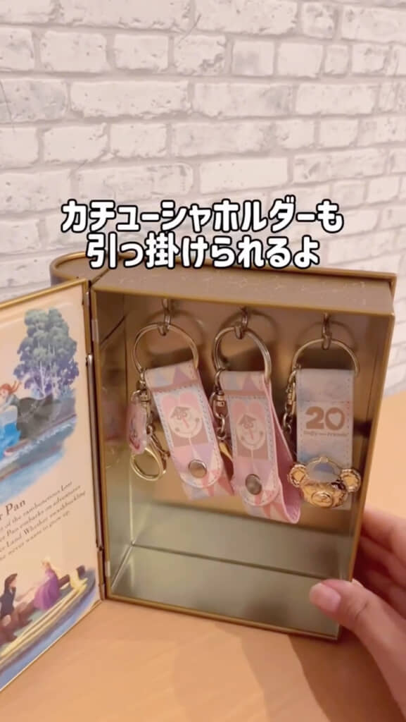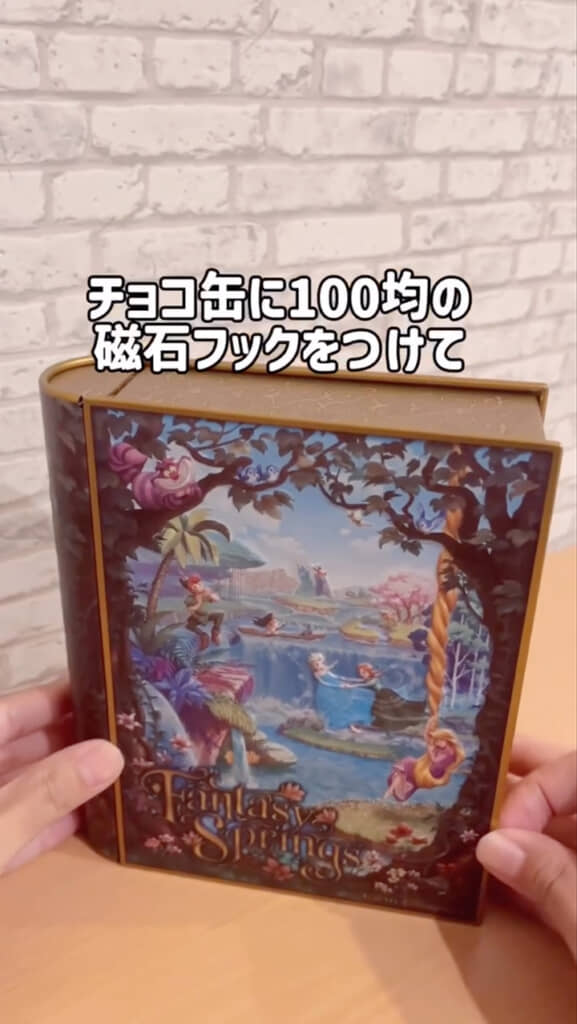 2つ目は、「ファンタジースプリングス」のチョコレート缶。本のようなデザインで自立するタイプなので、中に100均の磁石フックを付ければ、かわいいキーケースに早変わり! インテリアとしても映えるので、玄関やリビングに置いておくのにもぴったりです。