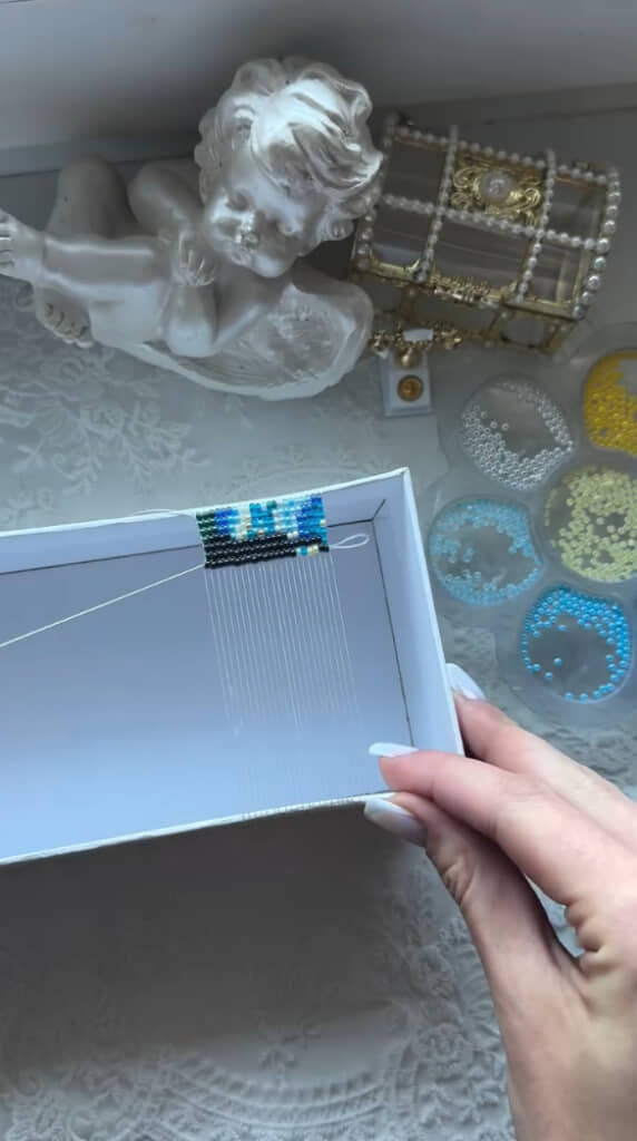 一列目を終えたら、あとはひたすら絵の色合いと同じになるようにビーズを通し続けていきます。なかなか根気のいる作業ですが、投稿者さんは手慣れた様子で次々にビーズを通し、みるみるうちに織った部分が伸びていきました。