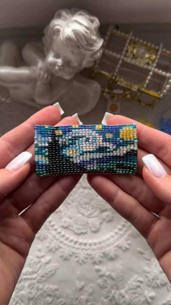 端まで織り終えてから箱の裏の糸を切り、ビーズを接着剤で固定したら……極小サイズのビーズアートで再現したゴッホの「星月夜」が完成です!