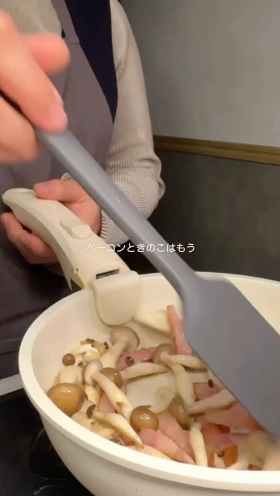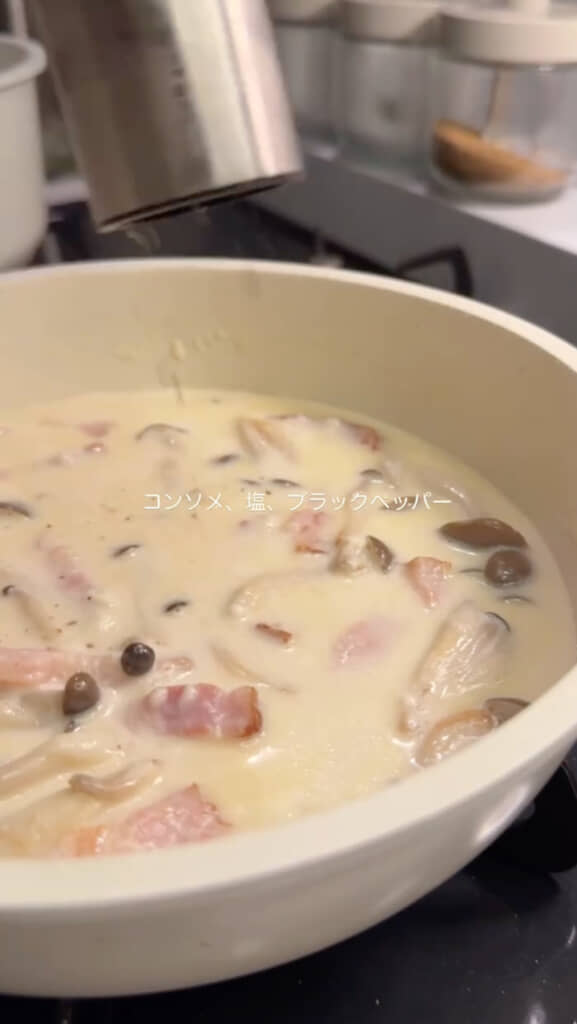 お次は、ソース作り。フライパンにバター10グラムを溶かし、棒状にカットしたベーコン入れて香りが出るまで炒めたら、しめじを加えてさらに炒めます。そこへ牛乳200ミリリットルを注ぎ、沸騰したら火を少し弱めて煮詰めます。仕上げにMIXチーズ40グラム(粉チーズでも代用可)を加えて溶かし、コンソメ小さじ1、適量の塩とブラックペッパーで味を整えればソースができあがりです。