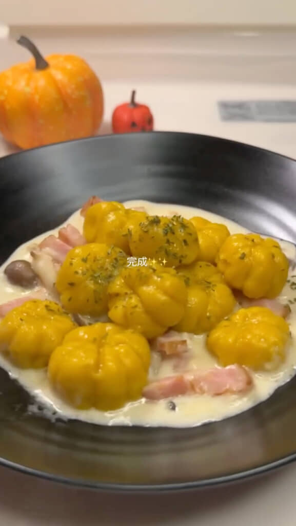 最後にお皿にソースを敷き、上からかぼちゃのニョッキを乗せてパセリを散らせば完成です。今回はクリームソースにしましたが、トマトソースにすればハロウィン感がさらにアップ。ニョッキといえばじゃがいもを使うイメージですが、かぼちゃやさつま芋などでも作れるそうです。ソースや素材を変えて、いろいろなアレンジを楽しんでみてはいかがでしょう。