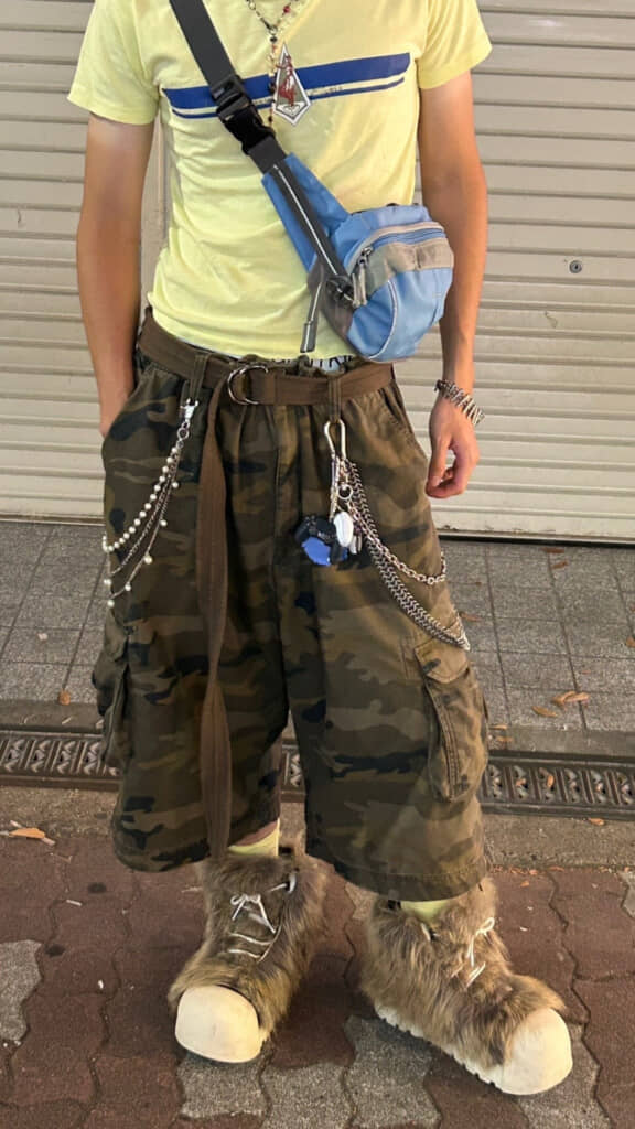おしゃれは足元からと言いますが、現在の人工靱帯さんが履いている靴からもこだわりが感じられます。1つは、もふもふとしたファーが付いた見た目が印象的で、こちらはブランド「F.V.V.O」と「XU」のコラボスニーカー。その存在感のあるスニーカーを引き立てるような上下ブラックのスタイルでも、サングラスやチェーンといった小物を使うことでスタイリッシュにみせています。