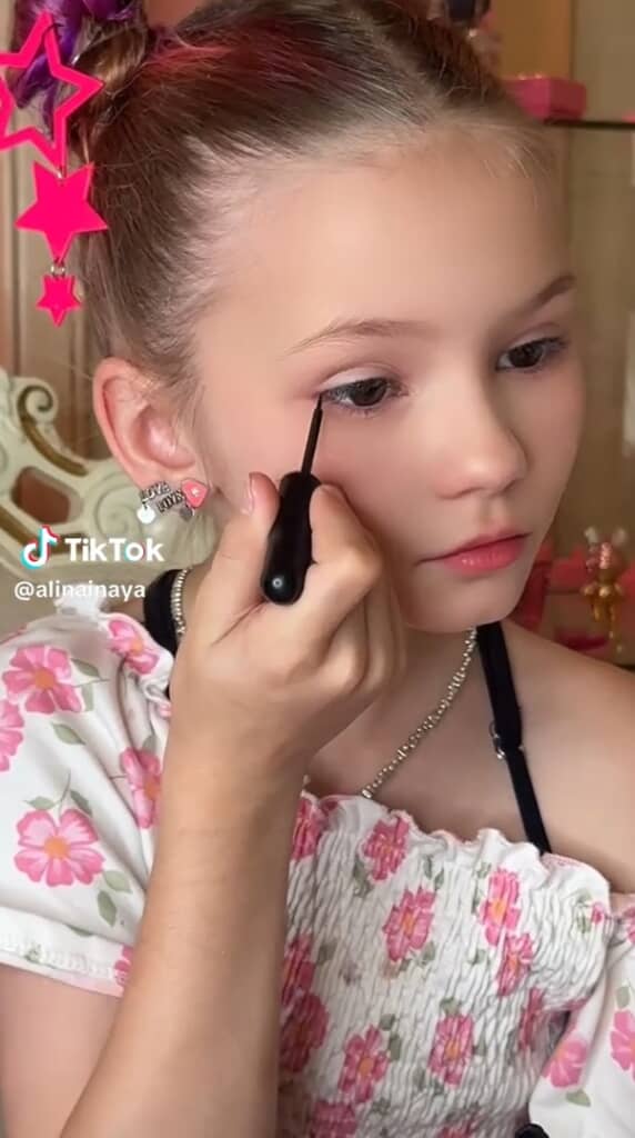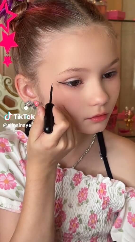 1/4)リキッドアイライナーを手にした9歳の女の子。迷いなく筆を目尻に当てて慎重にラインを描き始めます