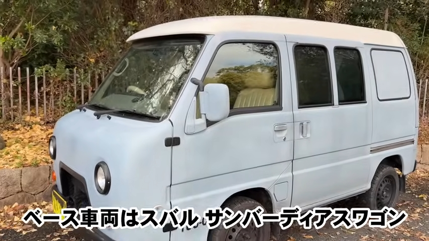 車中泊の相棒として使っている車両は、スバル「サンバーディアスワゴン」という軽自動車。ワンボックス型でスライドドアを備えたクルマで、前オーナーによって一部外観にもカスタムが施されています。