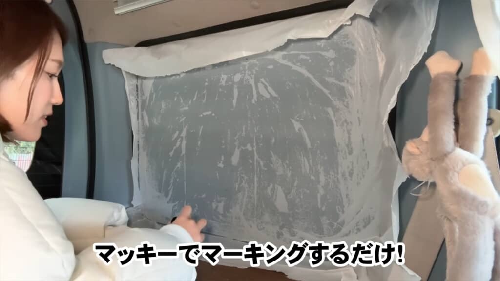 有孔ボードを取り付ける場所を確認すると、車体の両サイドに大きな窓枠が残されています。うきさんは助手席側は機能性重視、運転席側は快適性重視と決めて、完成後のイメージをふくらませます。