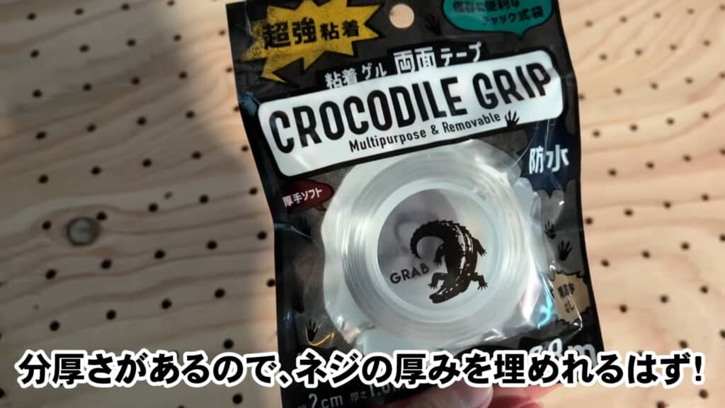 取り付けには両面テープを使いますが、ボードの四隅にツマミを設けるために一般的な薄っぺらいテープでは役に立ちません。そこでうきさんは厚さ1.8ミリもあるゲルタイプの両面テープを採用。ツマミ裏のネジで浮き上がる分をカバーできれば……と期待して、実際に有孔ボードを貼り付けてみると、想像以上にガッチリと張り付いて、しっかりと固定できました。