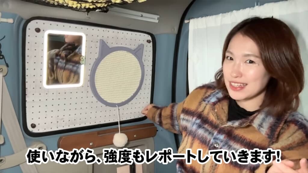 しっかりと固定できたことを確認した有孔ボードに鏡や猫の爪とぎ、フックなどを設置したら完成。何もなかった状態と比べると車内の印象は大きく変わり、本格的な雰囲気になりましたね。手が届く範囲で小物を管理できて、ちょうど良い位置に鏡があるのも快適そうです。