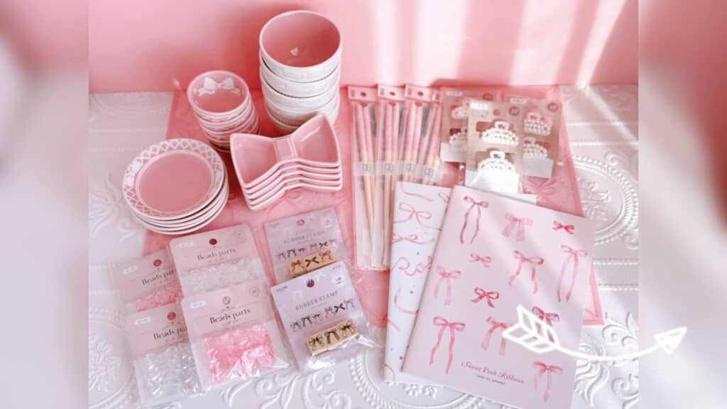 そんなみとさんが今回「すごいの出た」と紹介したのは、100円ショップ・セリアで販売している文具や食器など複数のアイテム。いずれも淡いピンク色やリボンのモチーフをふんだんに取り入れたガーリーなデザインです。