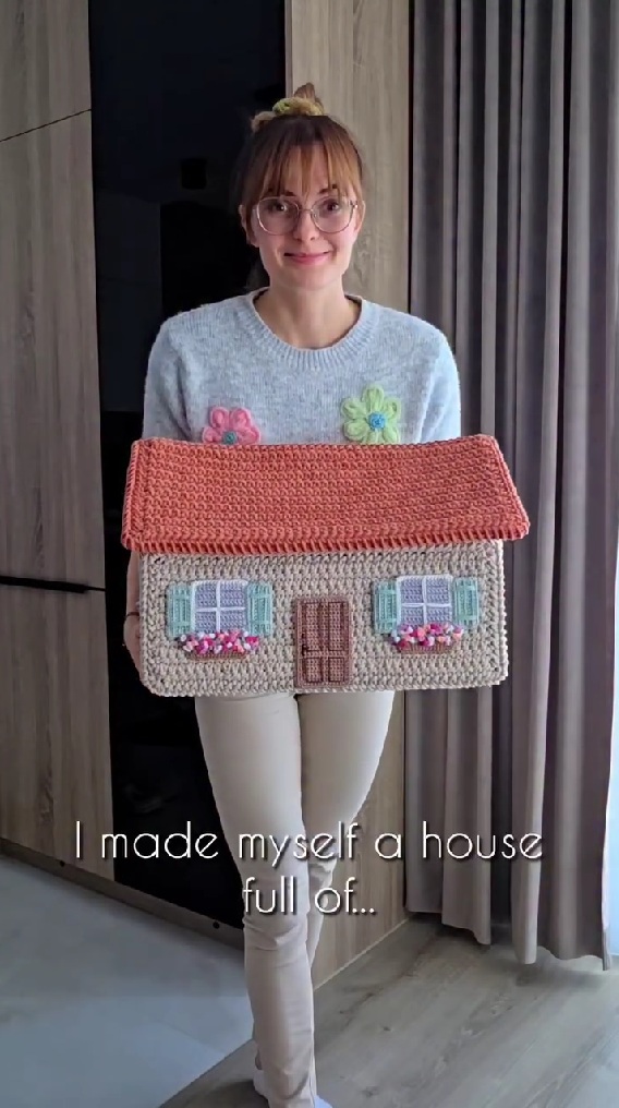 動画の冒頭で、投稿者さんが両手に大きな作品を抱えて登場。お家の壁は淡いベージュ、屋根はオレンジがかった明るい赤で編まれています。ピンクの花が飾られた小さな窓、ミントグリーンの雨戸、そして玄関のドアなど細部までこだわりが感じられる作品は、一見ドールハウスのようですが、どうやら違うようです。