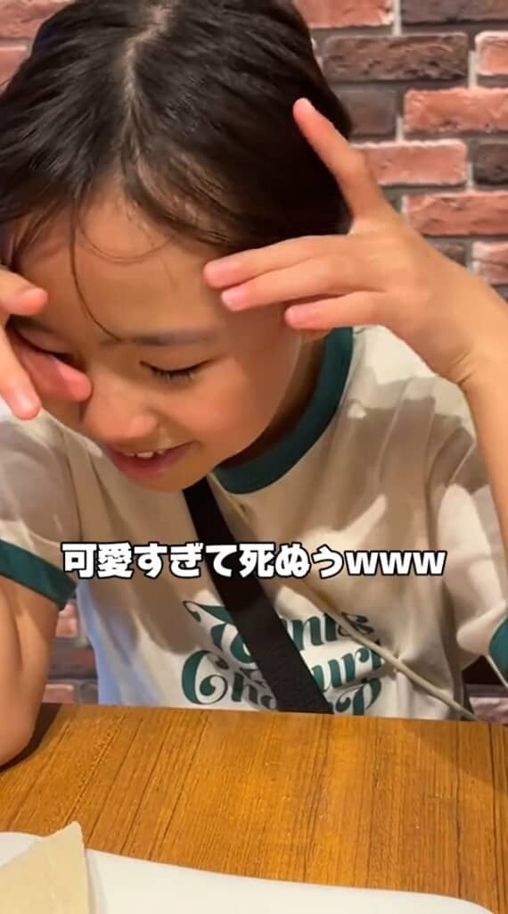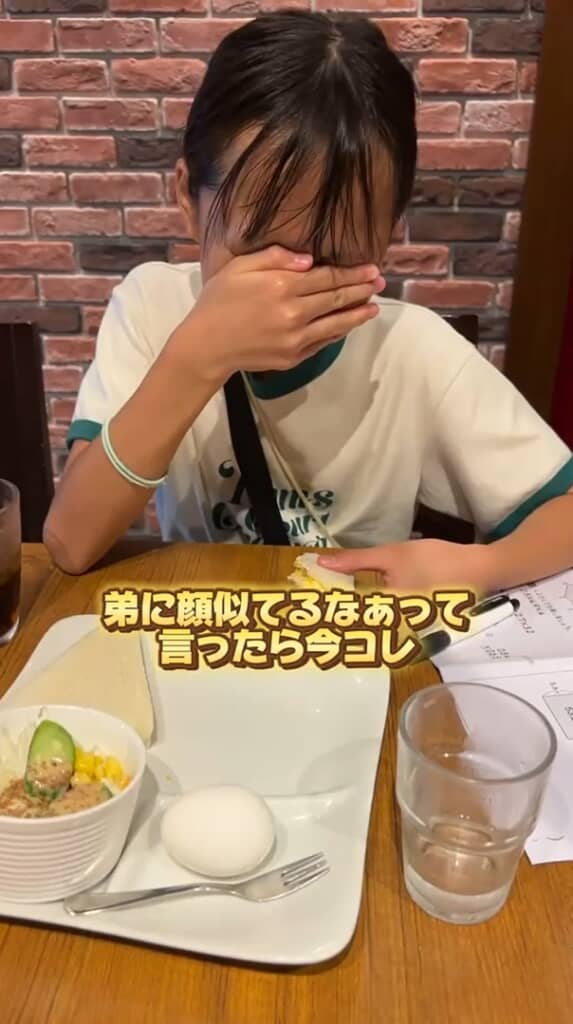 今回投稿した動画では、冒頭から手で顔を隠した長女が登場。少し震えているようで、どうやら泣いているよう。“いったい何が?”と思っていたら、「弟に顔似てるなあって言ったら今コレ」とテロップで理由が説明されました。これは、うれし涙でしょうか?