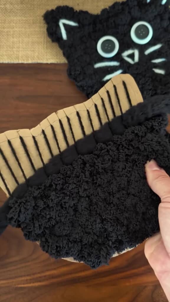 用意したのは、猫の顔の形に切った段ボール。上下の端には細かい切れ目がたくさん入っています。その切れ込みに黒い毛糸を通しました。