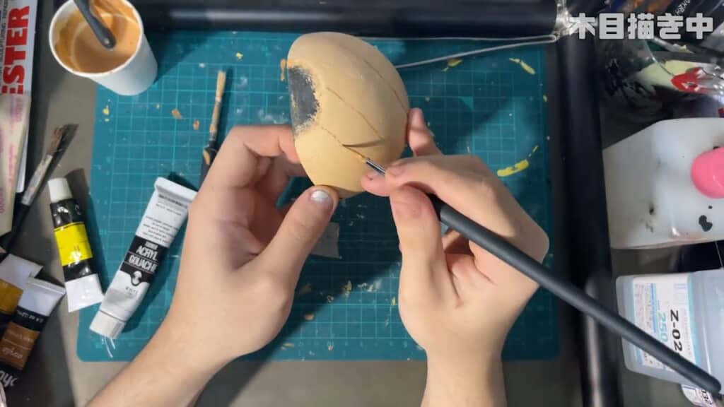 パーツの質感に合わせて、塗装にはラッカー系やアクリル絵の具などさまざまな塗料を使用。本来木製である下半分は筆塗りで木目を描き加えています。