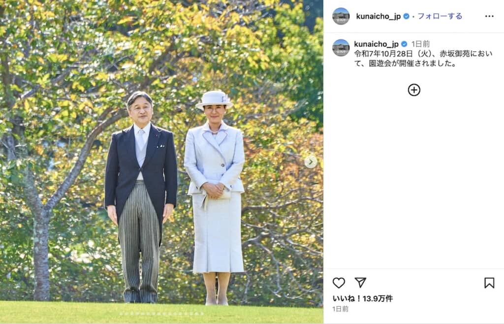 園遊会は毎年、春と秋の2回開催されており、秋篠宮家をはじめとした皇族が出席。今回、天皇陛下はモーニング姿で、皇后さまは淡い水色の洋服、愛子さまはワインレッドの洋服を着用されました。