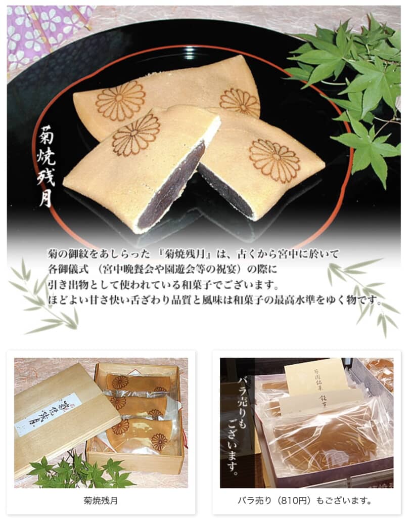 話題になっているお土産は、和菓子「菊焼残月(きくやきざんげつ)」。和菓子店「御菓子司 麻布 菊園」でも入手でき、同店の公式サイトによると、古くから園遊会や宮中晩さん会などの儀式で引き出物として使われているといいます。