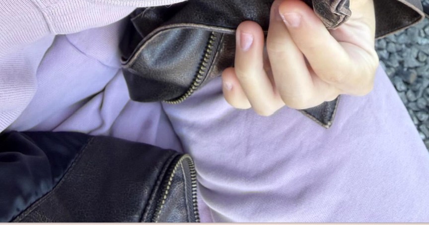 ラベンダー色のスウェット素材にレザージャケットを羽織っている永遠さん。異素材を組み合わせたラフでかっこいいスタイルです。