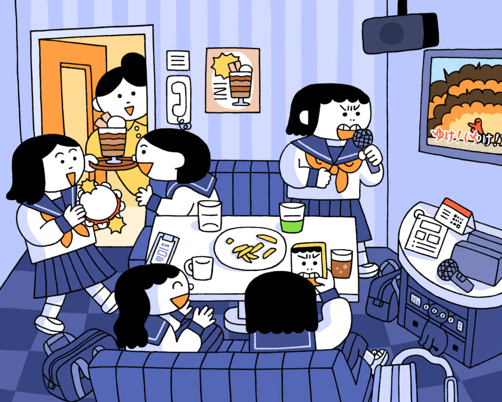 カラオケで楽しく歌っている少女たち。さわやかにきらめいたまぶしい青春の1ページですが……おやおや? 制限時間は1分間。どこかに紛れ込んでしまった1匹の「ねこ」を探してみましょう。