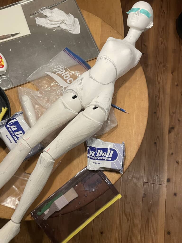 なんと、女性の球体関節人形が完成! 細身ですらっとしたモデルさんのような見た目で、大きな瞳やシュッとした口元が印象的。体全体のバランスや関節の球体まで細かく作られており、精巧なフィギュアのようで、粘土でできているとは思えないほどのクオリティーです。