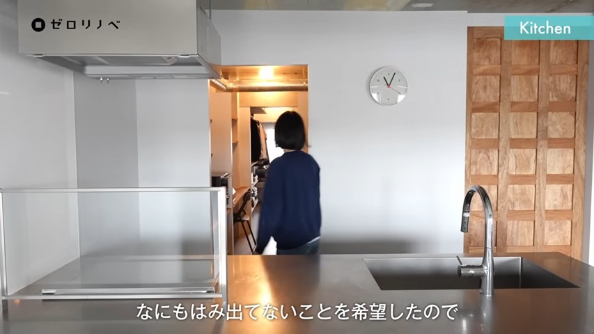 物が少ないリビングで、ひときわ目立つのがピカピカのステンレスキッチン。「キッチンの上に何も置かない、ただステンレスの箱がリビングにあるだけ」という希望から、シンプルでスタイリッシュなデザインに落ち着いたそうです。「料理をした後も片付けようという気になって、いつもキレイに保てる」メリットもあるのだとか。