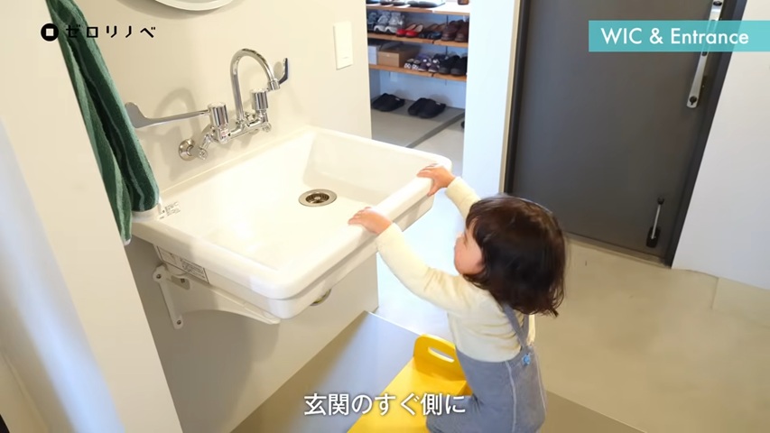 玄関すぐの所に洗面台。子どもが手を洗う習慣がついたとのこと