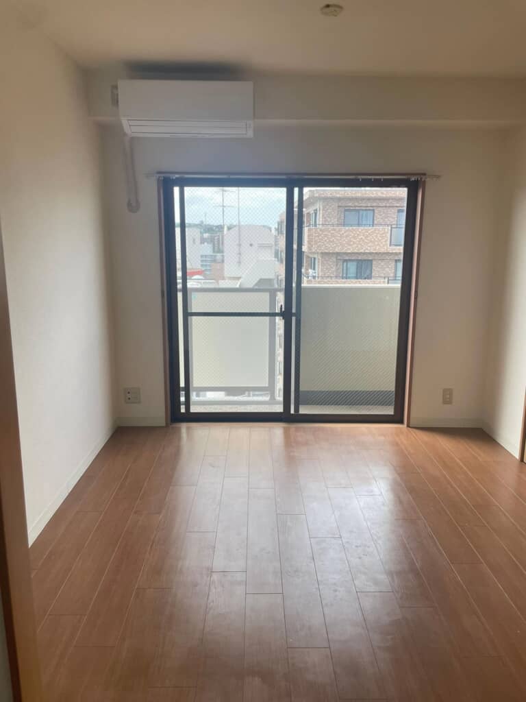 リビングは当初板張りの床で、ベランダに続く掃き出し窓がある部屋でした。その後、床にはホワイトとグレーの大理石風なフロアタイルを張り付け、洗練されたおしゃれな雰囲気に。掃き出し窓にはしっかりとしたライトグレーのカーテンが掛けられ、室内はテレビや心地よさそうなグレーのソファーや、柔らかい光を放つスタンド照明などが設置されました。