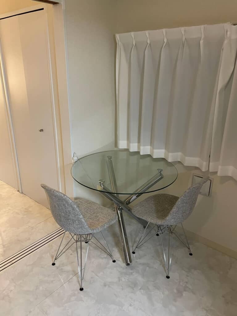 ダイニングキッチンには、隅に小さな丸いガラスのテーブルとグレーの椅子を2脚置きました。2人暮らしの現在は、こちらが食卓として使われているよう。側の小窓には、白いカーテンが掛けれらていて、朝の優雅なひとときが目に浮かびますね。