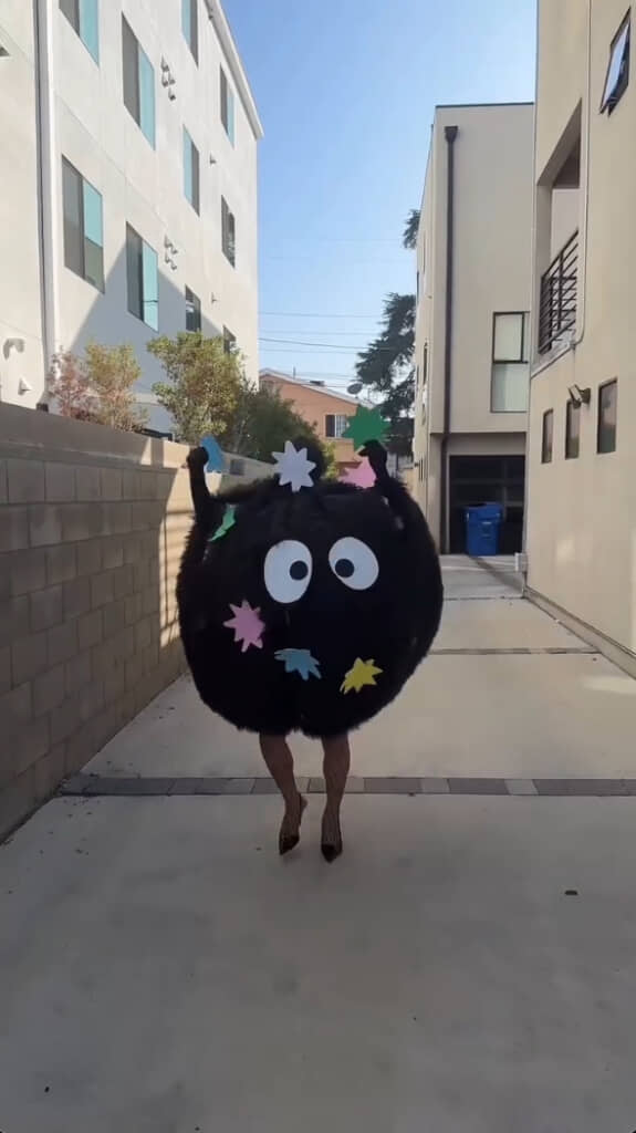 仕上げとして巨大なサッカーボール型風船に体を突っ込み、ここから先は外での作業。風船を膨らませ、さらにその表面を黒いファー生地で覆っていきます。そしてその上に先ほど作った目玉とトゲトゲに切り抜いた画用紙を貼り付ければ……! なるほど、確かに『千と千尋』版ススワタリです。