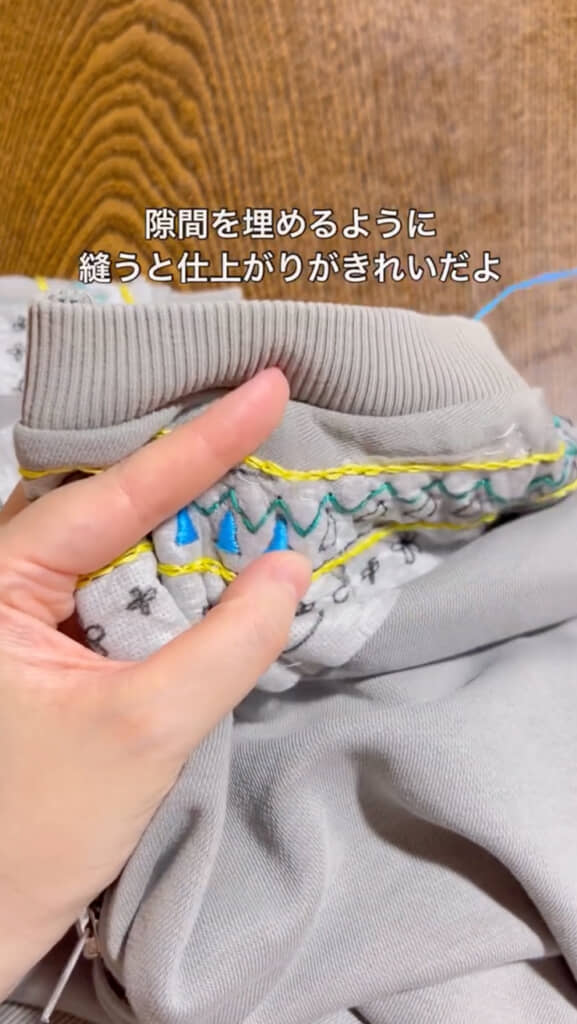 準備ができたらいよいよスウェットをカット。切断面を内側に折り込んでファスナーを縫い合わせていきます。ミシンで裏側を縫い、表からもステッチをかければファスナーの取り付けが完了。なお、スウェットをカットする際は定規を中に入れておくと切りやすいとのことです。