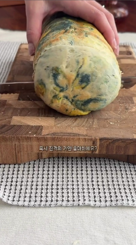 今回紹介するのは、アニメ『進撃の巨人』の調査兵団長エルヴィン・スミスをパンで再現した、ユーモアあふれる動画です。まな板の上に置かれたのは、1本のパン。表面は黄色や青、緑が入り混じったマーブル模様の少し不思議な色合いです。これを切ってみると……?