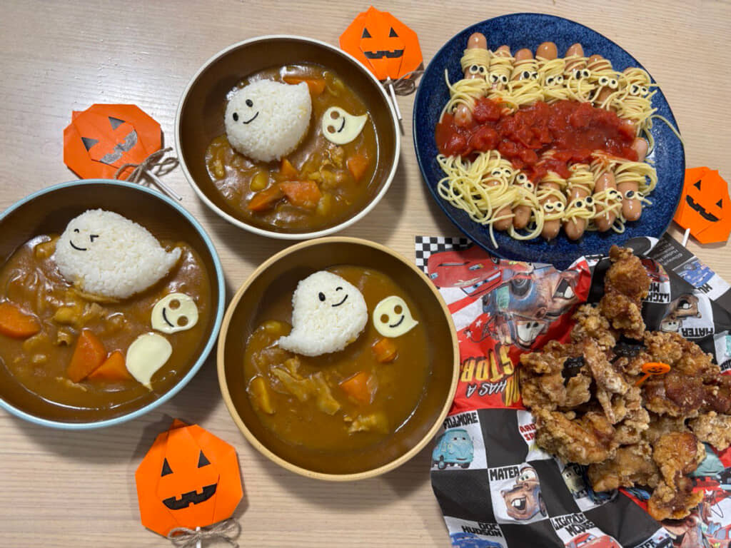 まずは子どもたちのご飯です。ハロウィーン仕様のカレーライスや唐揚げ、ソーセージなどが並んでいます。料理には顔を表現したデコレーションがほどこされ、キャラ弁のような見た目。かわいいお化けの顔がたくさん並び、子どもが喜ぶことまちがいなしの出来ばえです。