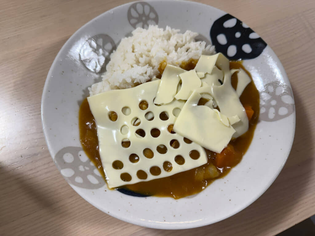 続いて、パパのご飯です。何の変哲もないカレーライスに、いびつな形のスライスチーズが乗っています。どうやらこのチーズは子どもたちのご飯に使われた余りで、デコレーションの切れ端のようです。なんともシュールな見た目で、親の献身が一目で分かる写真……。