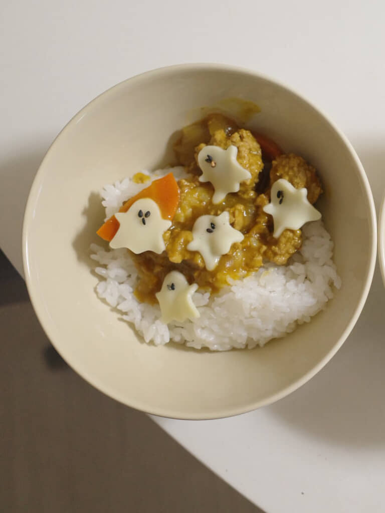 まずは、子どものために盛りつけたカレーライスです。ご飯とルーの上には、お化けのようなキャラクターが乗っています。チーズをくり抜いて作った白い体に、ゴマで顔を表現。キャラ弁のようなかわいさで、子どもが喜びそうな見た目をしています。