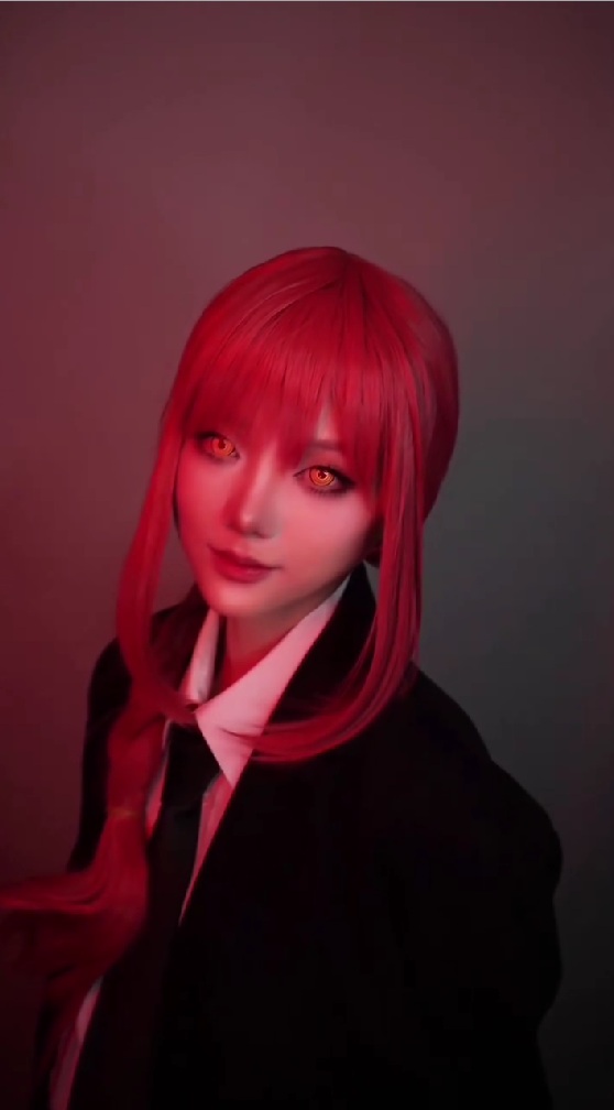 しかし次の瞬間、画面全体に赤い光が差し、投稿者さんの髪も鮮やかな赤に変化。長く編み込まれた三つ編みが肩に流れ落ちる姿は、マキマそのものです。瞳は吸い込まれそうな黄金色で、キャラクターの魂がそのまま憑依したかのような存在感ですね。
