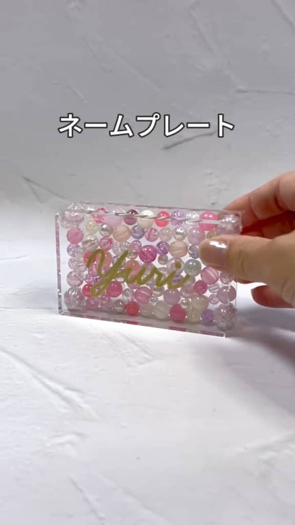プレートがしっかりと固定できたら、あとは油性ペンで名前を書いて完成。ビーズがキラキラ光るネームプレートに「このネームプレートかわいすぎない!?」と大満足の様子です。