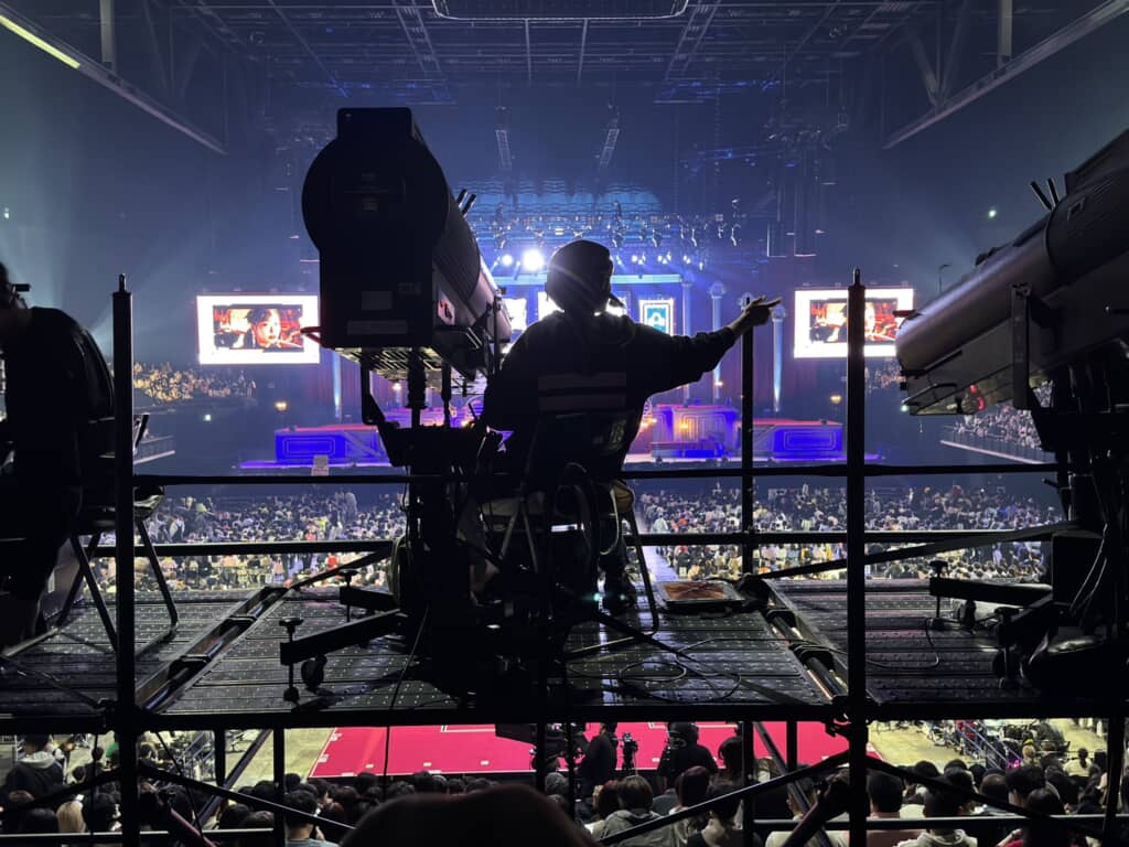 写真はライブ中の撮影可能タイムに撮影したもので、自席からの眺めが写されています。アイドルたちが歌って踊るきらびやかなステージが写っているのかと思いきや、目の前に広がっていたのは照明さんの雄姿!