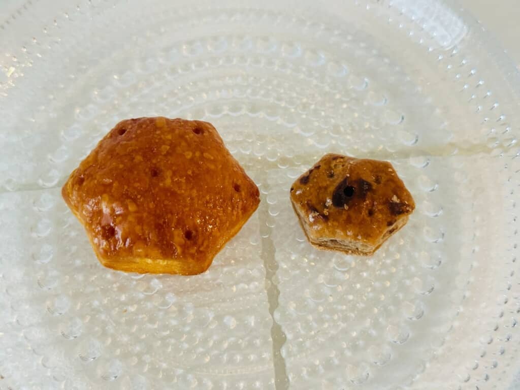 袋から出すと、ボリュームの違いにびっくり! ころんとした見た目と指先でつまめるサイズ感が特徴の通常の「パイの実」に比べ、「おおきなパイの実」は、ビッグな見た目と共に、ツヤツヤとこんがり焼き上がった表面がとっても魅力的です。