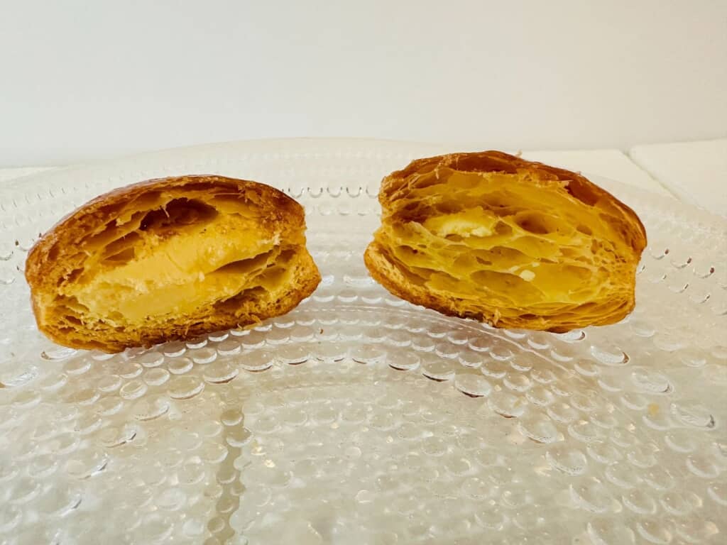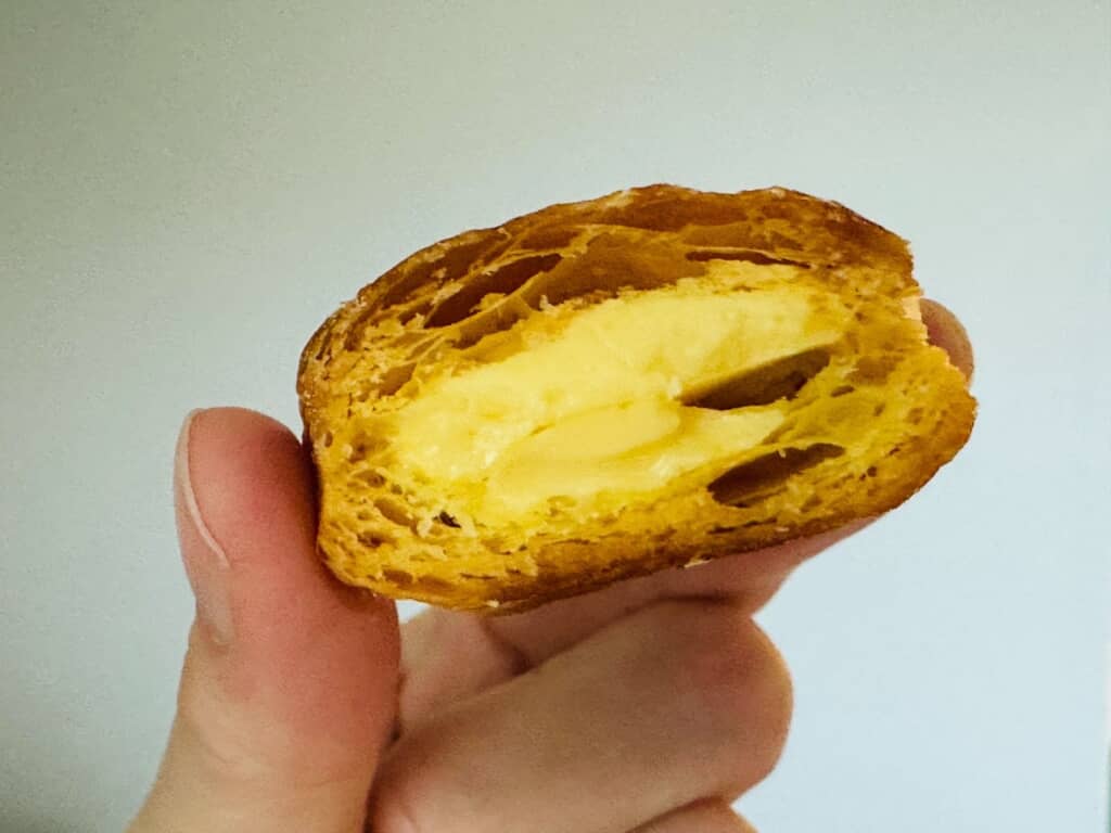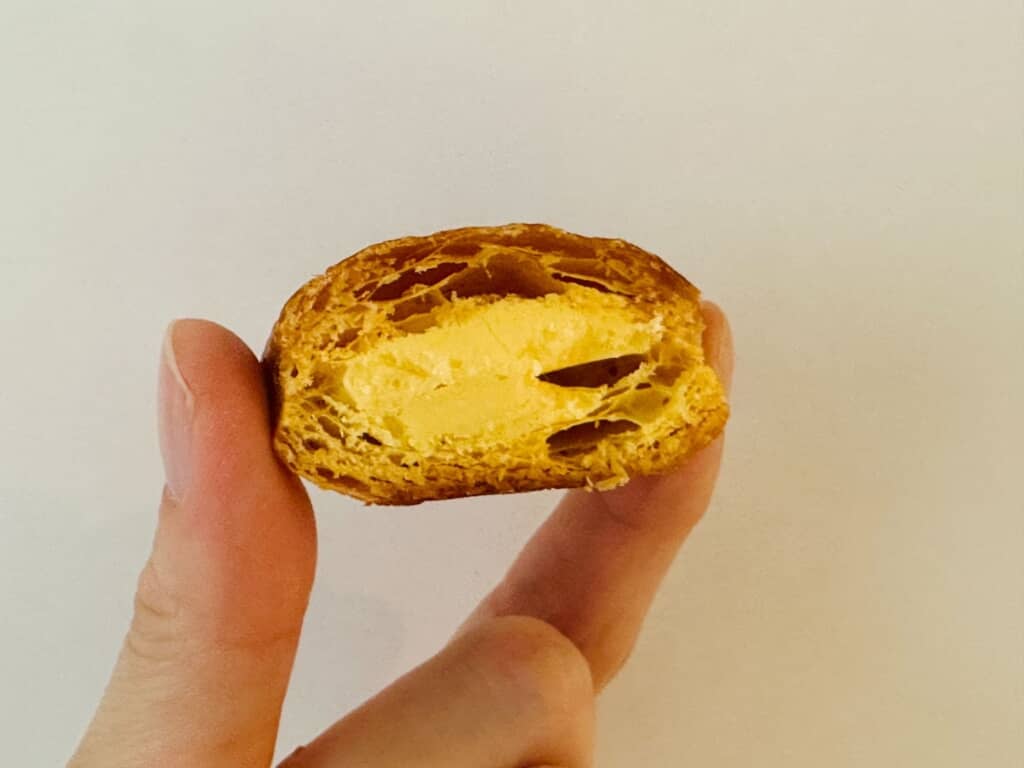半分にカットすると、中のコーンポタージュ風チョコレートがほんのり溶けています。ひとくち食べるとクリーミーな食感と共に、温めたことでさらに“コンポタ感”を楽しめました。もちろん常温のままでもおいしく食べられるので、お好みでトライしてみてください!