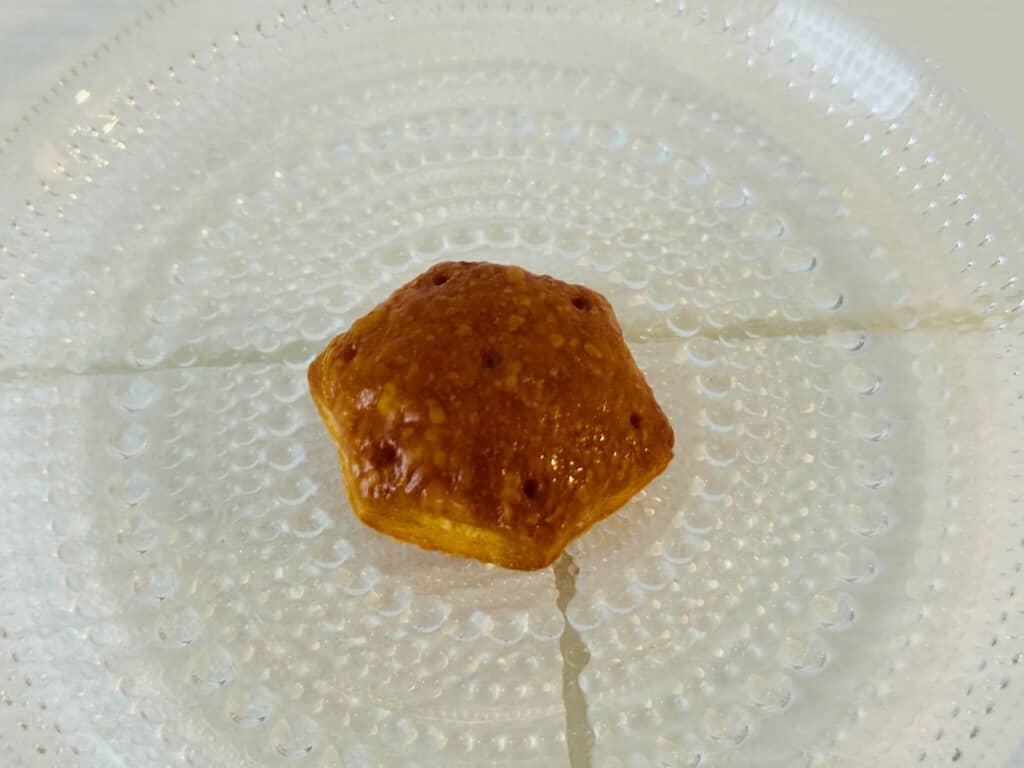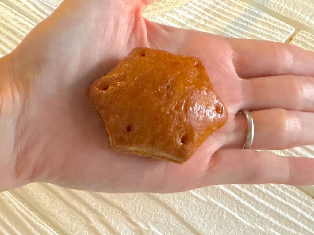 手のひらに乗せてみましたが、筆者の手のひらでギリギリ収まるサイズ感でした。パクッとつまんで食べるよりかは、両手で“もぐもぐ”食べるといった表現が適しているように思います。