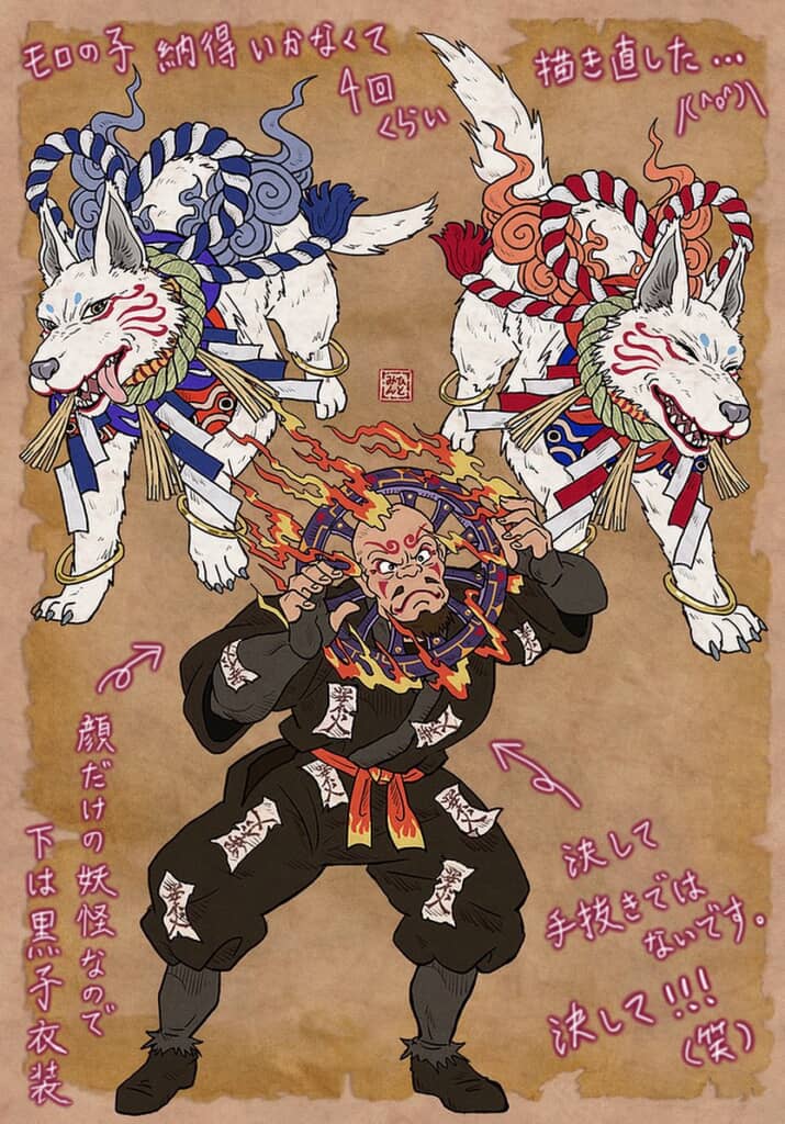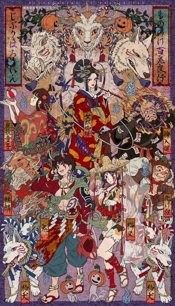 ひとみんさんの「もののけ百鬼夜行」は、まるで絵巻物のような雰囲気と現在のポップカルチャーを組み合わせたような独特の筆致。レトロで、ワクワクするような楽しさがあって、とても魅力的な作品です。サンやアシタカやエボシたちが、もののけの“仮装”しているなんて……!