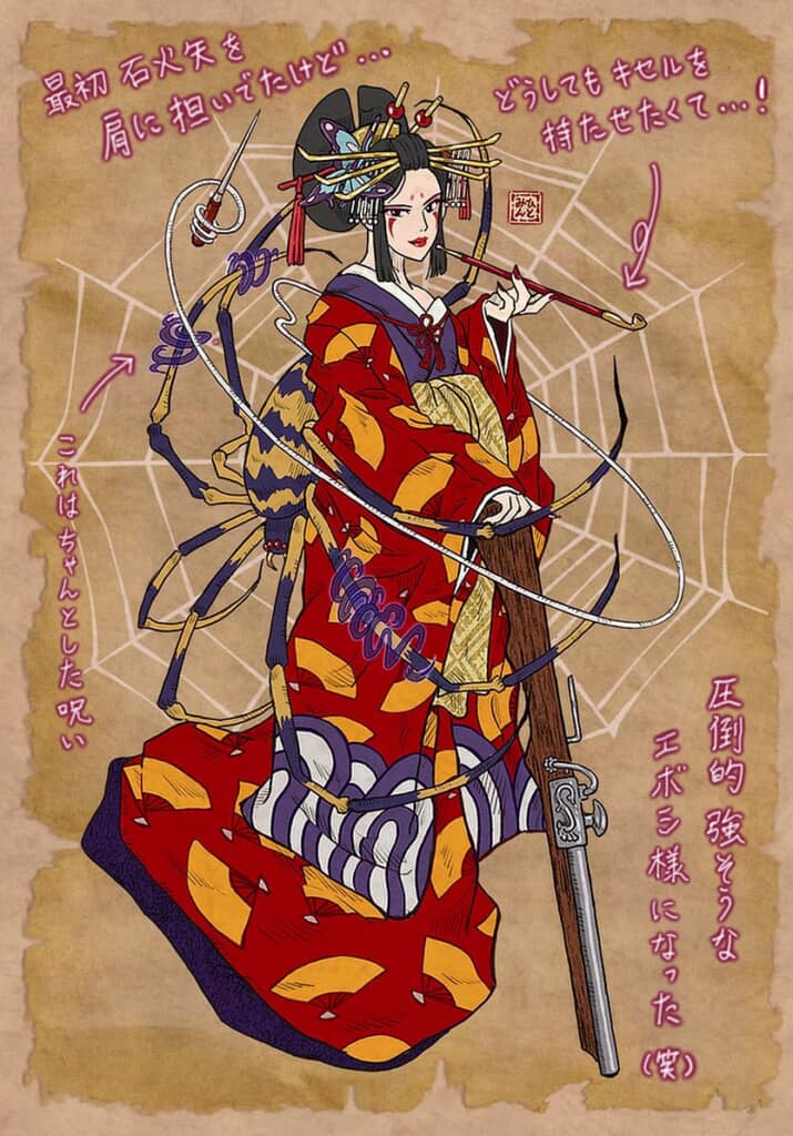 「女郎蜘蛛」となったエボシは絵の中央でこちらに目線を向け、迫力満点のたたずまいです。石火矢を左手で支え、右手にはどうしても持たせたかったというキセルが。蜘蛛と蜘蛛の巣をまとい、「圧倒的強そうな」作中そのままのイメージです。