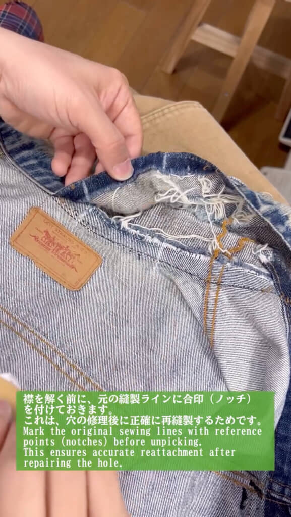 襟がボロボロになったジージャン、プロはマスキングテープを貼って…… 驚きの仕上がりに「すごい職人技」「完璧な修理」