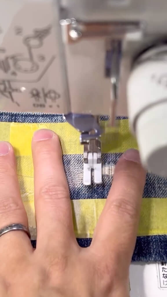 糸が固定できたら、デニムの縦方向に約3ミリ間隔でステッチを入れ、再びマスキングテープで外周を囲います。最後にミシンで穴をしっかり縫い付け、襟を縫い戻したらリペアが完成です!